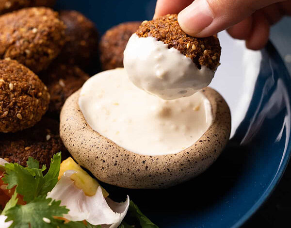 Made from fried chickpeas, falafel is usually eaten with pita bread, fresh vegetables, and tahini sauce.