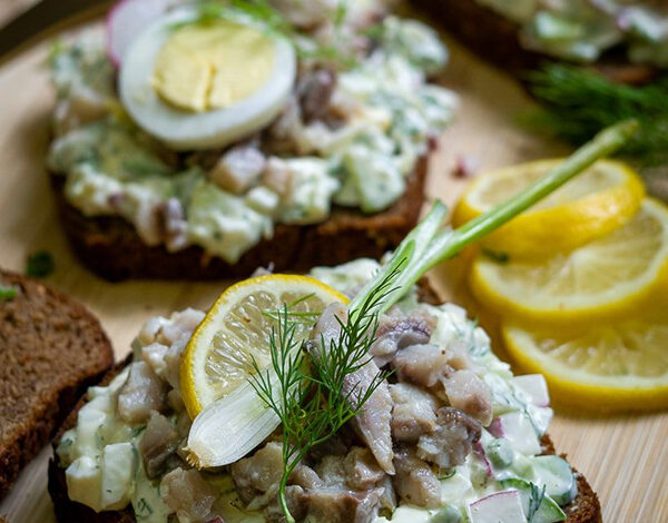 An open-faced bread topped with various toppings such as fish, eggs, cheese, or vegetables.